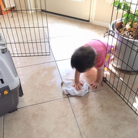 *犬の水いれをひっくり返して床がびしょぬれになった。(ちょっときれぎみだけど、我慢しながら)「床がびしょぬれになっちゃうからやめようね。床をふきふきしようか」と言ったら、(彼女の判断で)犬用のぞうきん入れに雑巾をとりにいって、柵の中も外もふきふき頑張ってくれました。(できる限り怒らずに)一緒に片づけ方針を続けたい。(写真)