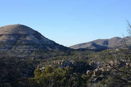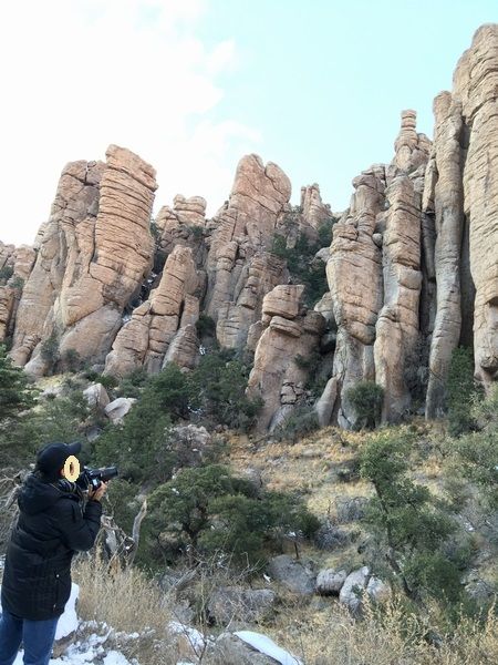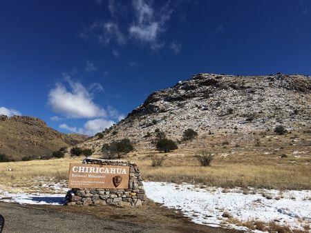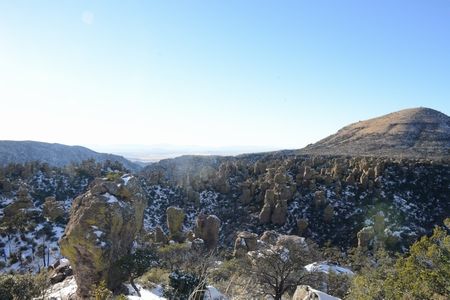 ニューメキシコを抜けて、アリゾナに入ったあたりではすっかり雪もなくなり、行けるか心配していたChiricahua National Monumentに無事に到着。途中、オオカミちっくなでかい犬を目撃。ここでは、雪化粧した山がお出迎え。