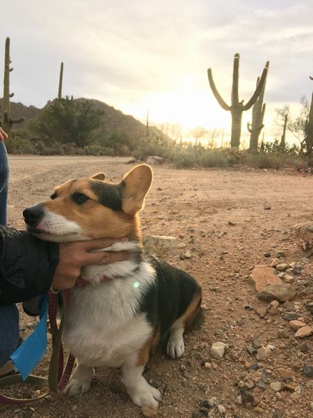 朝日が登ってきました~。夫になでられて、至福顔の犬。ピクニックエリアと、舗装されたトレイルだけ犬OK。