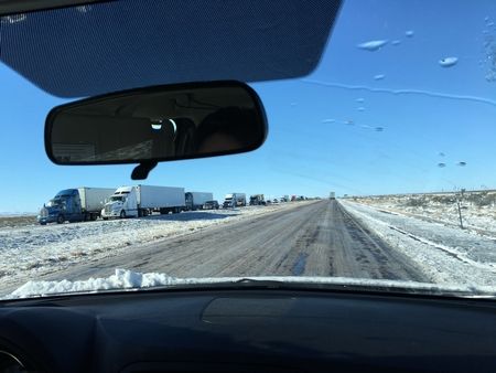 こんな状態でも、スピードを出す車がたくさんいて、そこいらじゅうで車が事故ってひっくりかえったり、路肩に落ちていました。警察も見かねたらしく、I10の東(テキサス)方面の車線は、パトカーが車線をふさいでゆっくりと走行することでスピード規制をしていました。この渋滞。