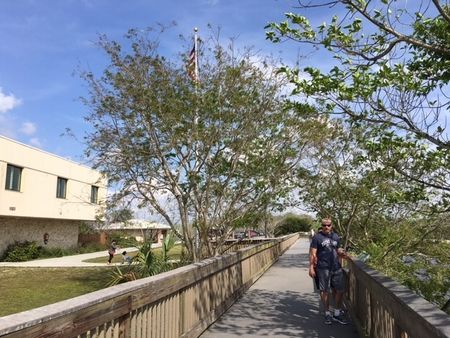 このビジターセンターの目の前の川が木道になっていて、ヘビ、ワニ、カメがみられるというので、歩いてみました。